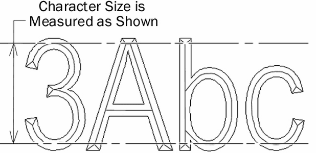 The above illustration shows how to measure the character height of an engraved steel stamp. Actual character size is measured from the very top center point, to the very bottom center point, of the character.